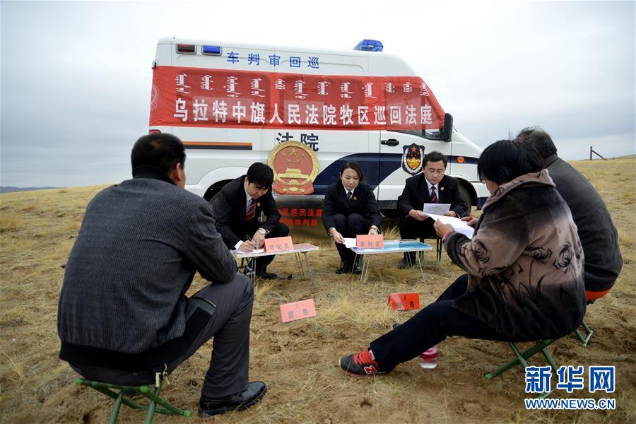 2014年10月30日,内蒙古乌拉特中旗牧区巡回法庭在草原上调解一起民事纠纷案。