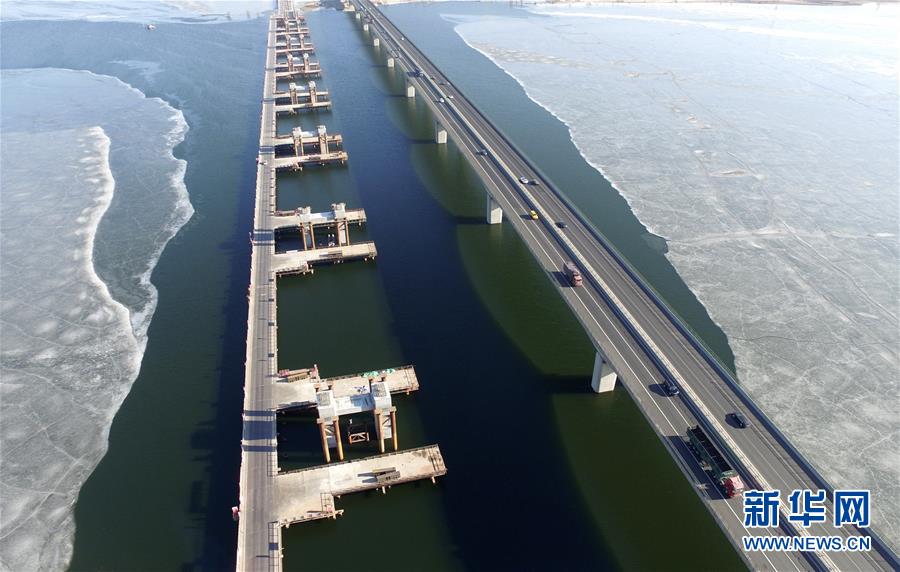 这是2017年2月14日航拍的横跨官厅水库的京张高铁特大桥(左)与京张高速公路特大桥。京张高铁是北京冬奥会交通配套工程。