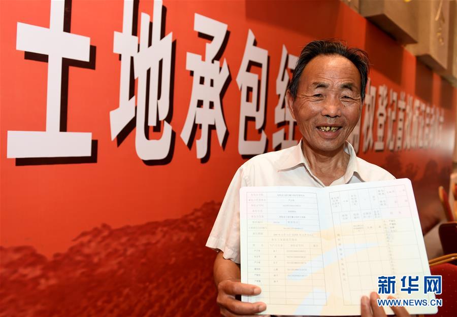 2015年7月8日,安徽省农村土地承包经营权确权登记首批颁证启动仪式在中国农村“大包干”发源地——安徽凤阳小岗村举行,小岗村农民严立华展示领到的《农村土地承包经营权证》。