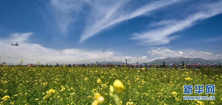 参加环青海湖国际公路自行车赛的自行车选手在青海门源回族自治县的油菜花田旁骑行(2018年7月28日摄)。