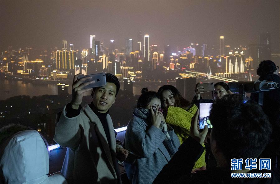12月30日,游客在重庆南山的观景平台上自拍。 新华社记者 刘潺 摄