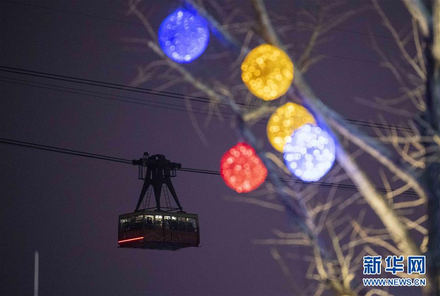 喜庆的迎春灯饰和夜色中的长江索道相映成趣(12月30日摄)。 新华社记者 刘潺 摄