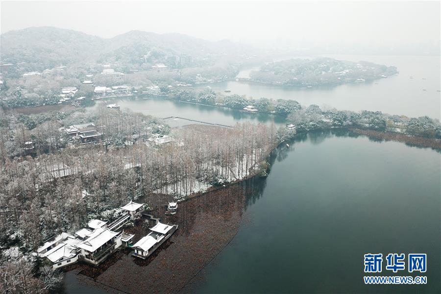 12月31日无人机拍摄的西湖景区的“曲院风荷”附近的雪景。自12月30日起,浙江省大部分地区出现降雪,杭州市西湖景区银装素裹,呈现独特的韵味,众多市民和游客纷纷来到湖边赏景。新华社记者 黄宗治 摄