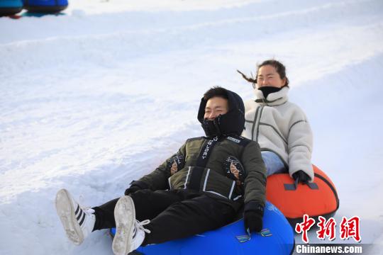 游客坐在滑雪圈上从特制的坡道上疾驰而下,既惊险又刺激,人们享受冰雪乐趣的同时与家人一起欢度新年。 年磊 摄