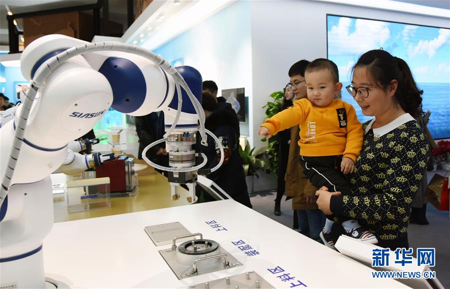 12月31日,一名儿童在家长的陪同下观看展出的机器人。新华社记者 潘旭 摄