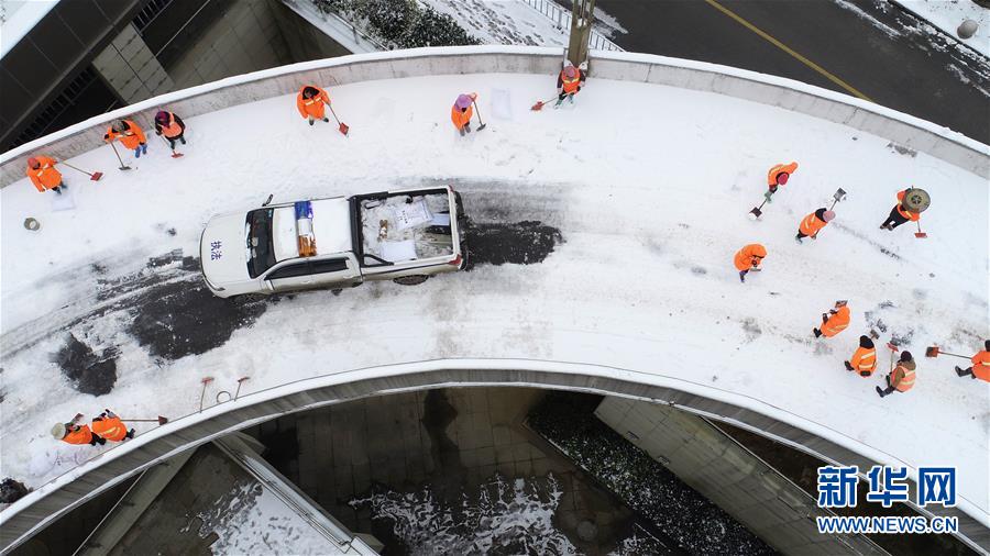 12月31日,在贵州凯里高铁南站,环卫工人在清理道路积雪(无人机拍摄)。 新华社发(吴吉斌 摄)