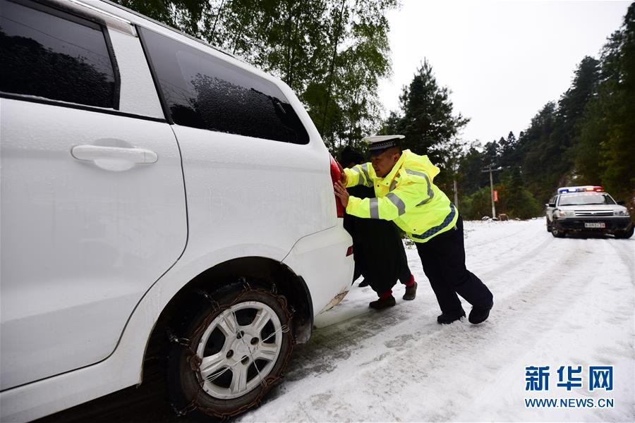 12月31日,在贵州省丹寨县排调镇,民警马寺文(右一)等在巡路途中帮助受困车辆脱困。 新华社发(杨武魁 摄)