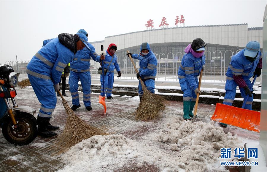 12月30日,在安徽安庆火车站,环卫工人在清扫路面的冰雪。 新华社发(江胜 摄)