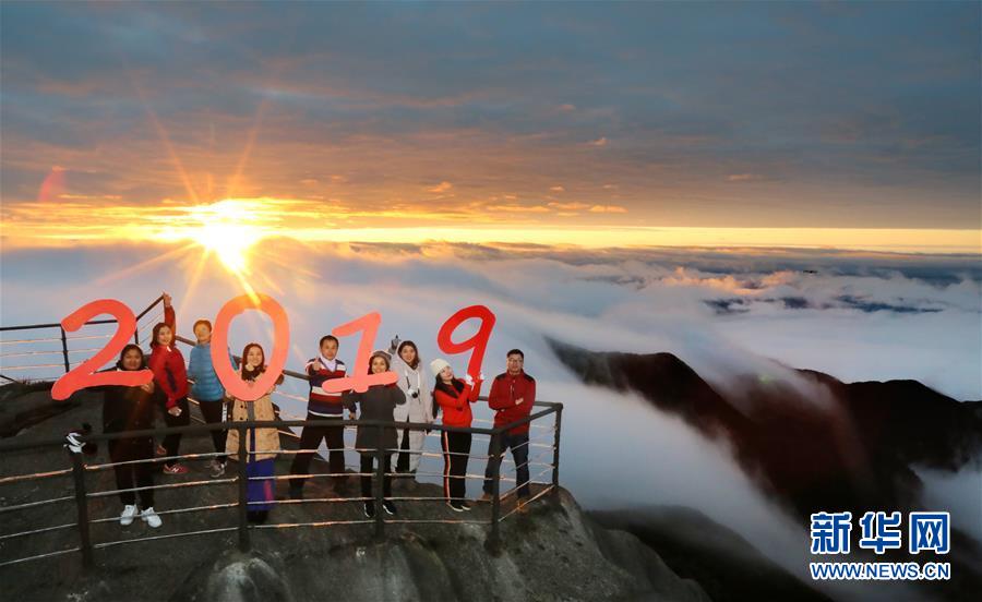 2019年1月1日,在福建省泉州市德化县石牛山,游客们登上主峰迎接新年第一缕阳光。