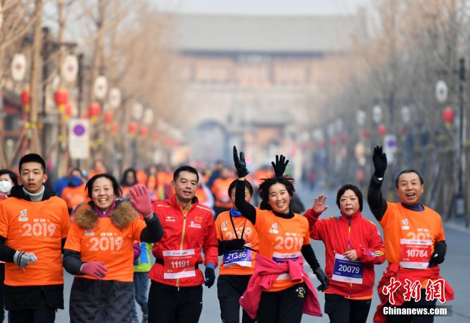 1月1日,新年伊始,5000名长跑爱好者齐聚在千年古城河北正定,伴着新年的第一缕阳光,以健身长跑的形式迎接2019年的到来。图为长跑队伍途经阳和楼。中新社记者 翟羽佳 摄