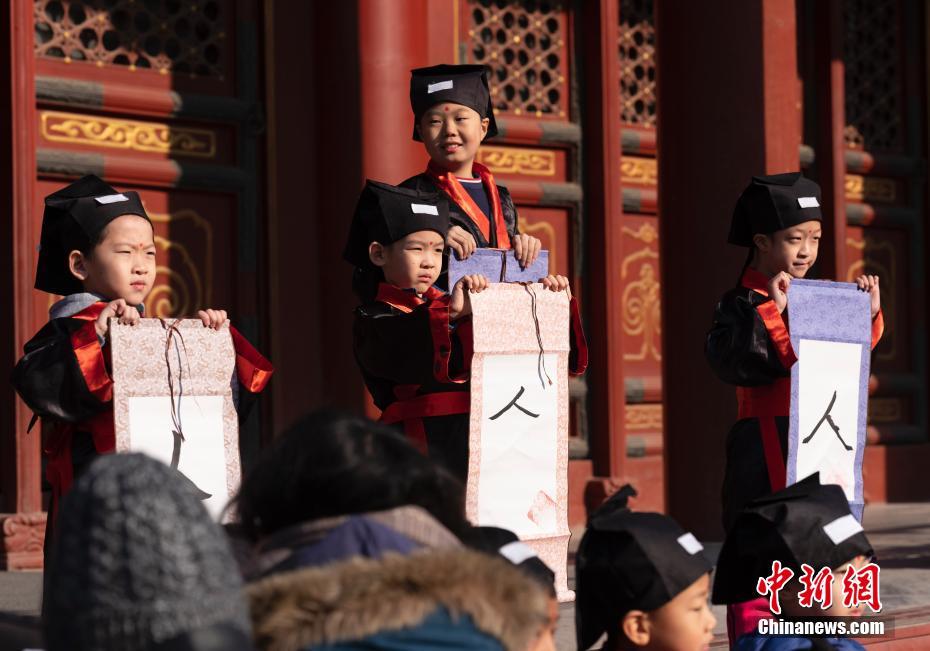 孩子们展示自己写的“人”字。中新社记者 侯宇 摄