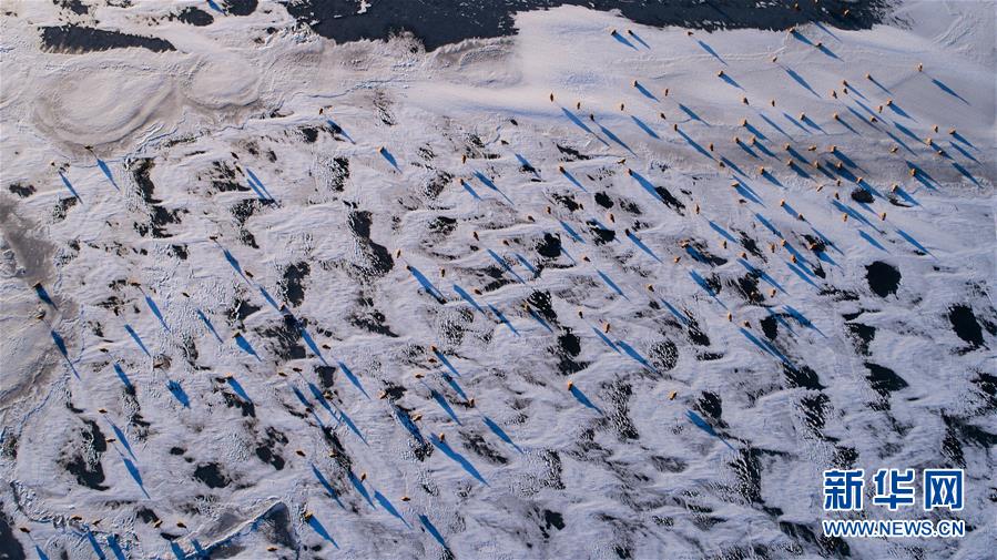12月31日,一群赤麻鸭在青海湖结冰的湖面上(无人机拍摄)。新华社记者 吴刚 摄
