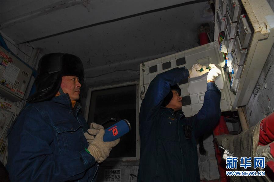 2018年12月31日,在吉林市昌邑区,吉林供电公司抢修班工人李岩(右)、张国权抢修一幢居民楼内的用电开关。
