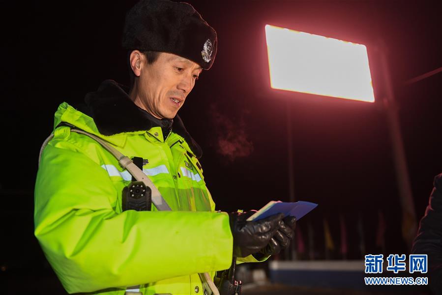 2019年1月1日,在长春市宽城区102国道附近,长春交警支队民警孙铁鸣检查过往司机、车辆的证件。