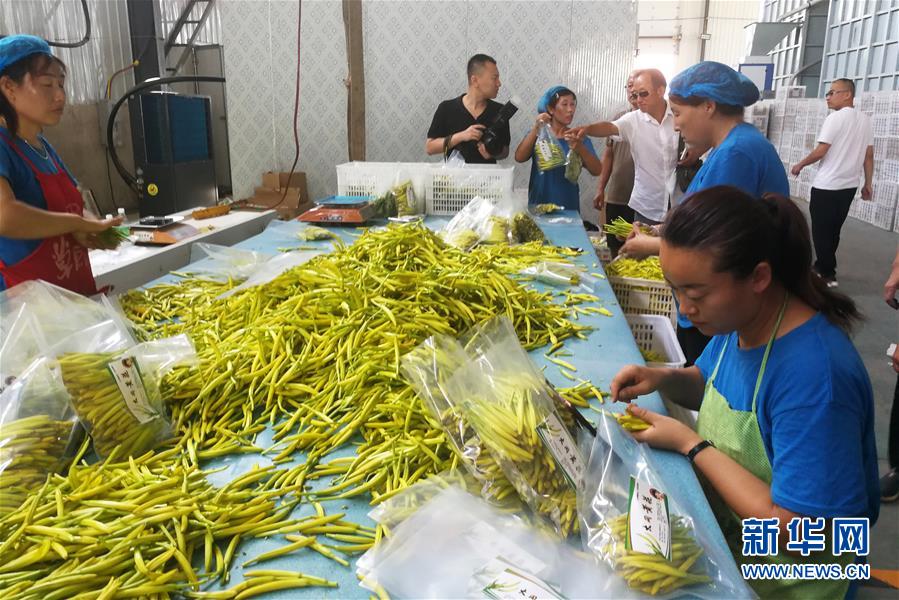工人在大同市云州区一家农副产品公司分装鲜黄花(2018年7月31日手机拍摄)。