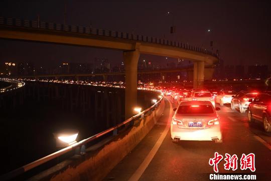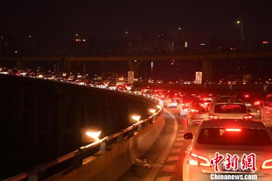 图为进入重庆城区的车辆在立交桥上堵成长龙。 陈超 摄