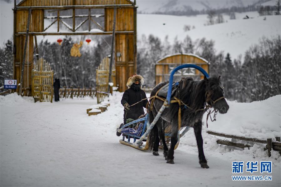 1月1日,在新疆禾木雪乡,一名当地居民驾驶马拉爬犁。 新华社记者 赵戈 摄