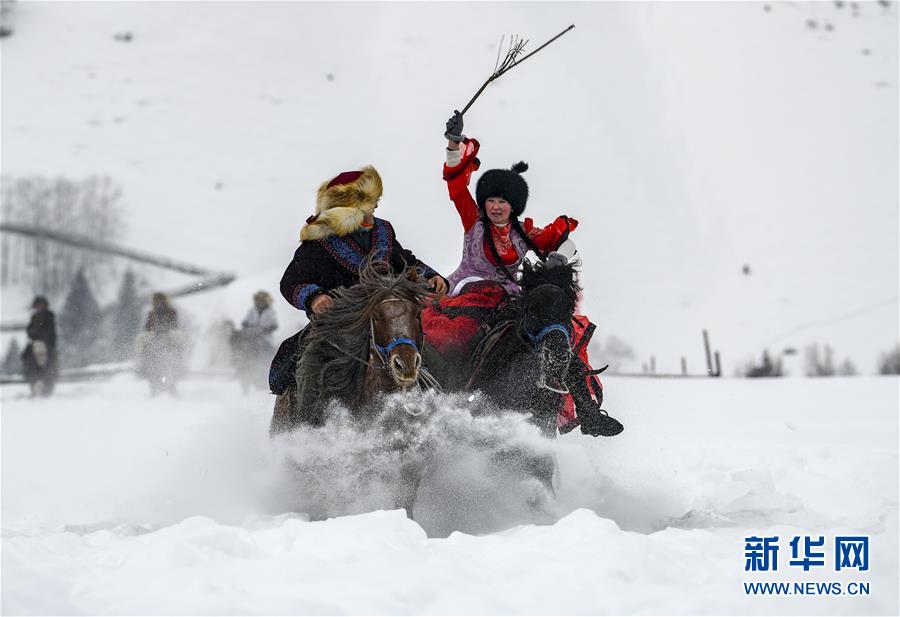 1月1日,在新疆禾木雪乡,当地居民表演“雪地姑娘追”。 新华社记者 赵戈 摄