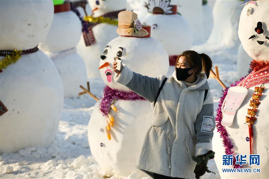 1月2日,一名游客在雪人群中自拍。 新华社记者 王松 摄