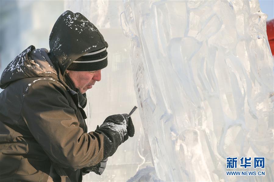 1月2日,选手在哈尔滨冰雪大世界内制作冰雕。 新华社记者王松摄