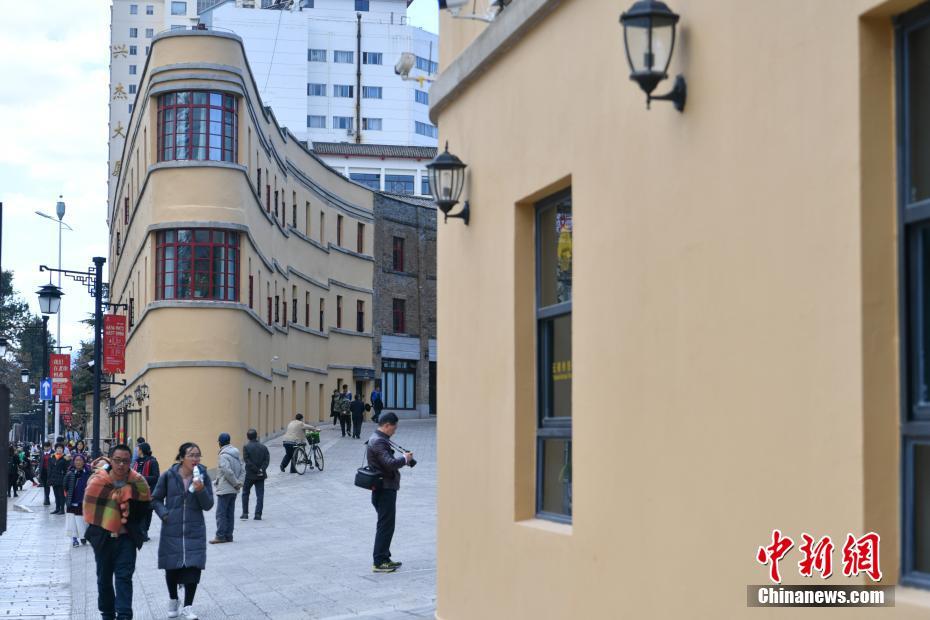 1月2日,昆明老建筑“胜利酒杯”内的精品酒店正在试营业。位于昆明市抗战胜利纪念堂前的两个弧形建筑因形似酒杯被称为“胜利酒杯”,是昆明的标志性建筑之一。图为游客在“酒杯楼”下留影。中新社记者 任东 摄