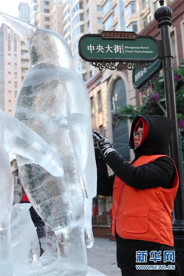 1月2日,选手在哈尔滨中央大街上修饰参赛作品。新华社记者 曹霁阳 摄