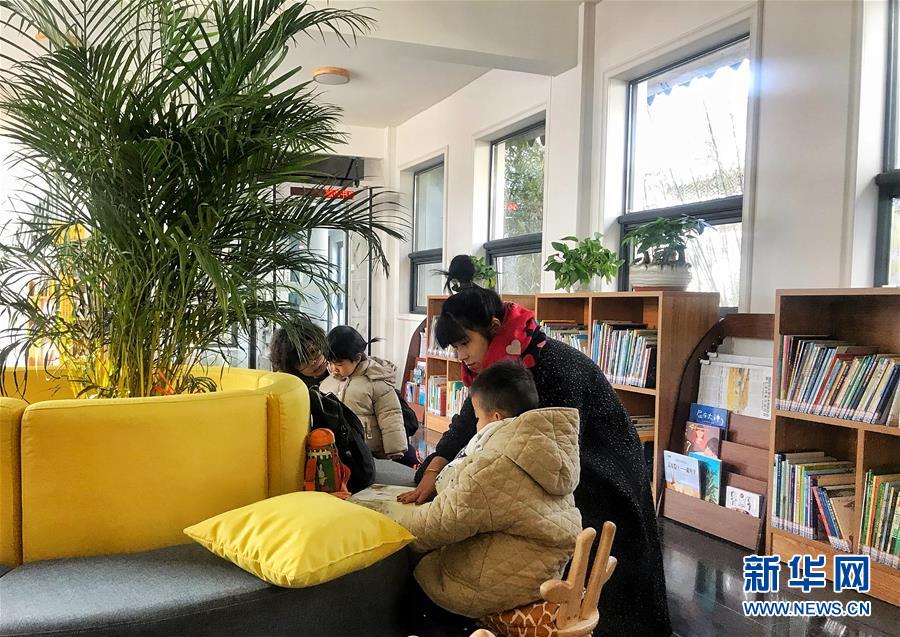 一位妈妈在河南省洛阳市兴洛湖城市书房儿童绘本区给孩子讲故事(2018年12月29日摄)。新华社记者韩朝阳摄