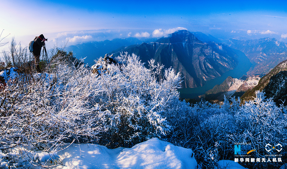 辞旧迎新之际,三峡地区迎来一场大雪,两岸青山被雪覆盖,千树万树“梨花”开。有别于绿水青山、红叶点缀的景致,银装素裹的三峡别有意境。图为摄影爱好者用相机记录巫峡雪景。新华网发(朱云平 摄)
