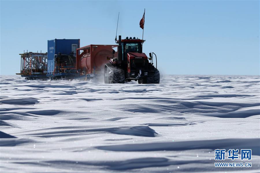 1月2日,昆仑队一辆“卡特”车行驶在南极内陆冰盖“大锅底”路段。 新华社记者刘诗平摄