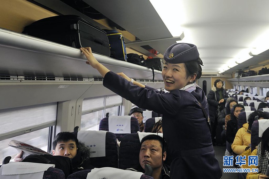 从丹阳到上海的动车上,一位女列车员在车厢里忙碌着,对旅客微笑着服务。 东方兰201 摄