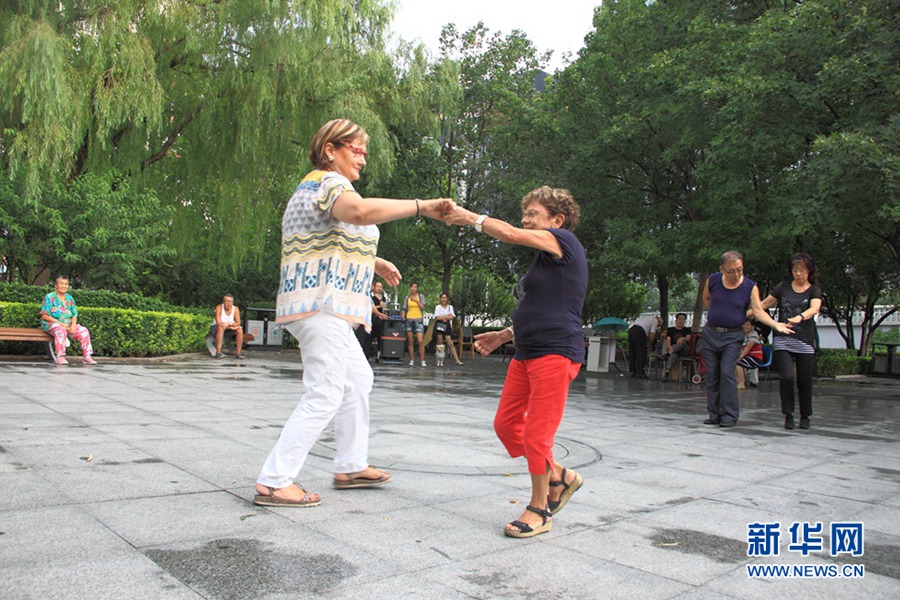 雨后的广渠门桥旁社区花园来了几个“不速之客”,看到社区花园居民跳舞,几个老外也随着欢快的音乐舞动起来。赵承顺 摄