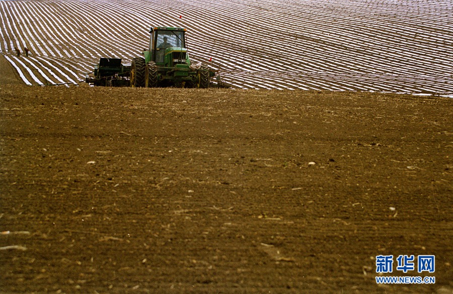 黑龙江省大西江农场一名农机工人驾驶先进的精准大农机进行大豆覆膜种植,两名职工紧随其后检查大豆播种质量。林进春 摄