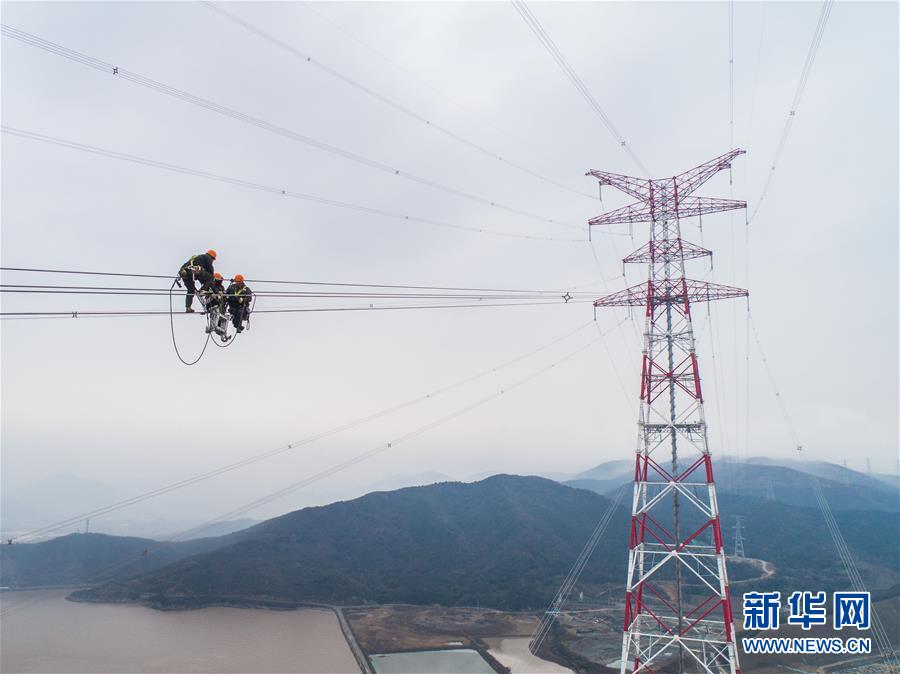 1月3日,施工人员沿着直径2.5厘米的导线进行高空行走,逐段排查导线隐患,确保投运后工程安全稳定运行(无人机拍摄)。新华社记者 徐昱 摄