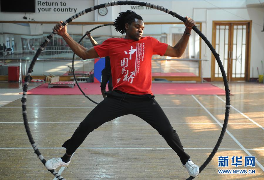 1月3日,在吴桥杂技艺术学校排练厅,来自肯尼亚的留学生巴斯瑞克练习“滚环”。 目前,在河北吴桥杂技艺术学校参加我国杂技类援外项目“2018年发展中国家杂技培训班”的26名留学生加紧排练,他们在这里已经接受了近半年的培训,学成回国后将从事杂技表演或杂技教育工作。 新华社发(苑立伟 摄)