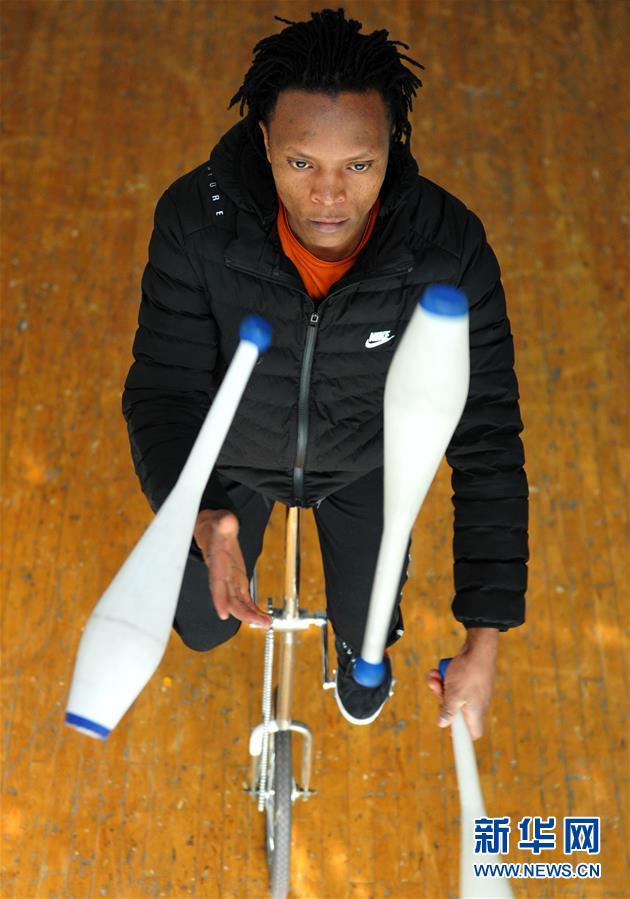 1月3日,在吴桥杂技艺术学校排练厅,来自肯尼亚的留学生伊萨卡练习“高车手技”。 目前,在河北吴桥杂技艺术学校参加我国杂技类援外项目“2018年发展中国家杂技培训班”的26名留学生加紧排练,他们在这里已经接受了近半年的培训,学成回国后将从事杂技表演或杂技教育工作。 新华社发(苑立伟 摄)