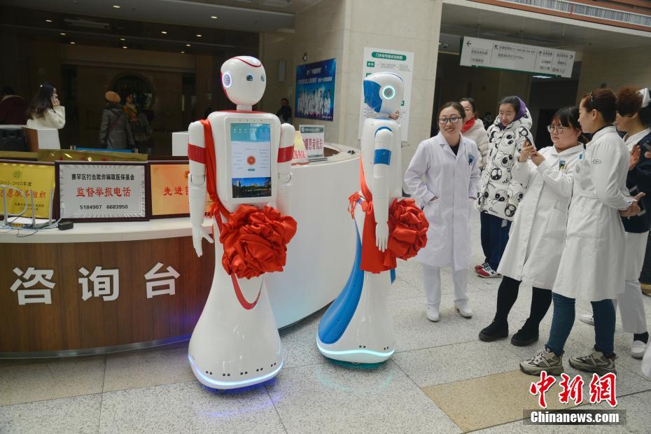 1月3日,医护工作者与导诊机器人互动。当日,位于呼和浩特市的内蒙古自治区人民医院迎来两名智能机器人导诊员,医院为他们分别取名为娜日和奥德,“萌萌”的外表吸引许多人前来使用。中新社记者 刘文华 摄