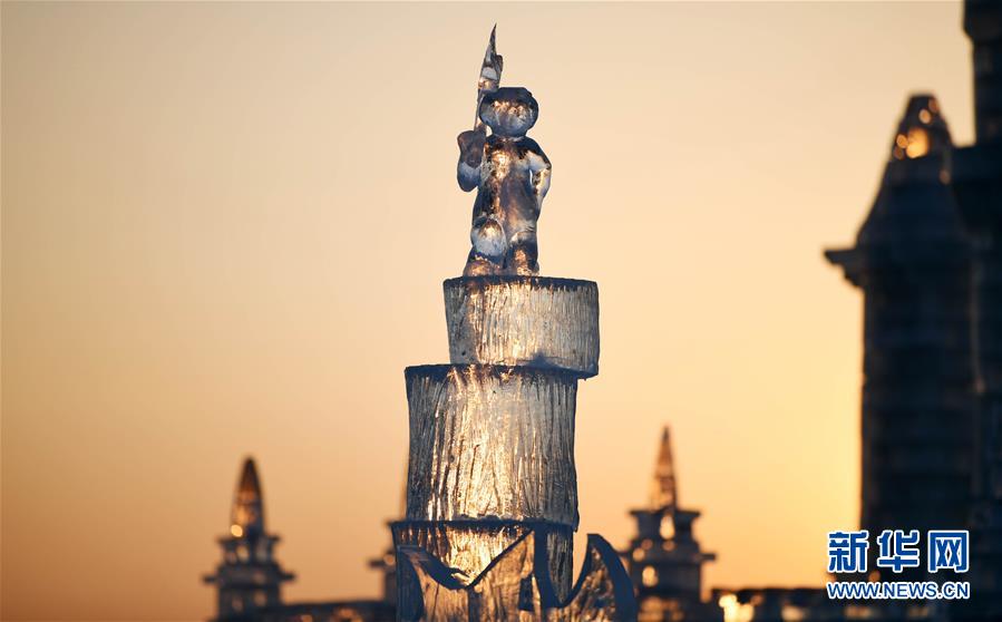 这是夕阳余晖中的冰雕作品局部(1月3日摄)。新华社记者 王建威 摄