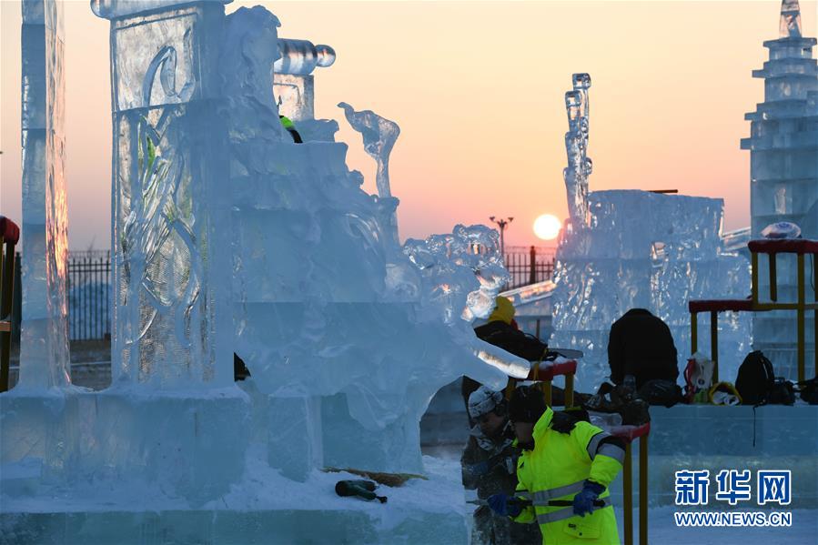 1月3日,选手在哈尔滨冰雪大世界园区对冰雕作品作最后收尾。新华社记者 王松 摄