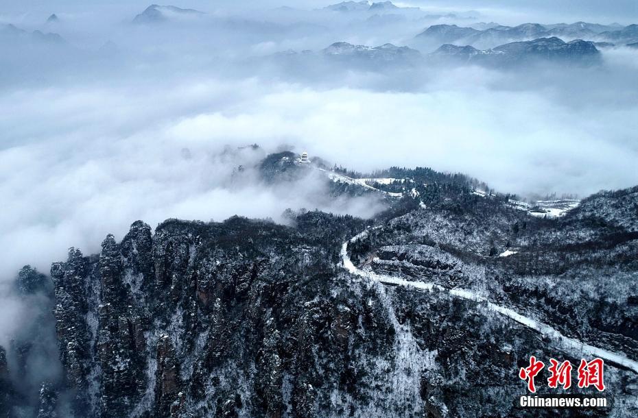 张家界武陵源现冰雪云海 银装素裹宛如水墨丹青