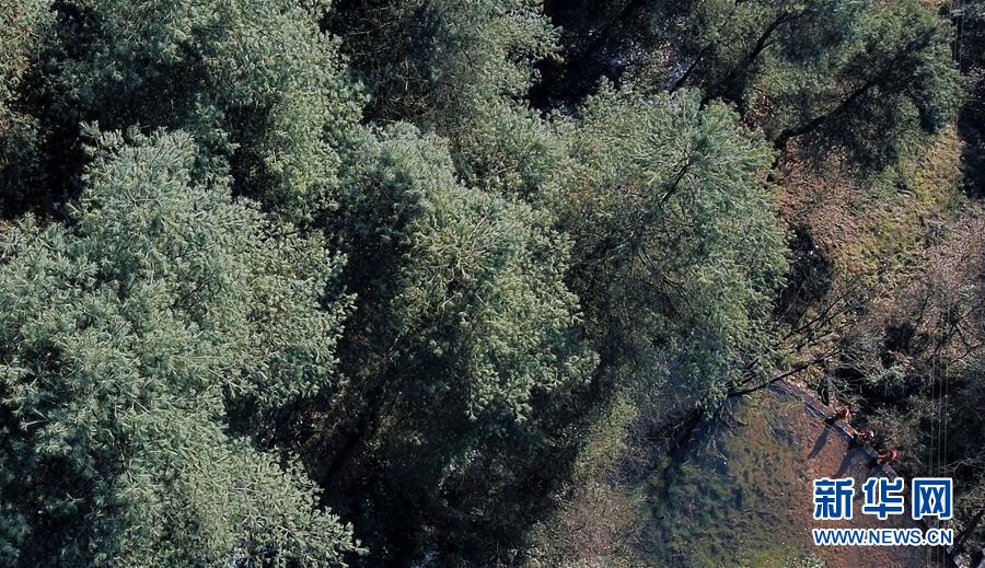 1月3日,张建、张忠、张华在拱拢坪林场护林巡山(无人机拍摄)。 新华社发(王纯亮 摄)