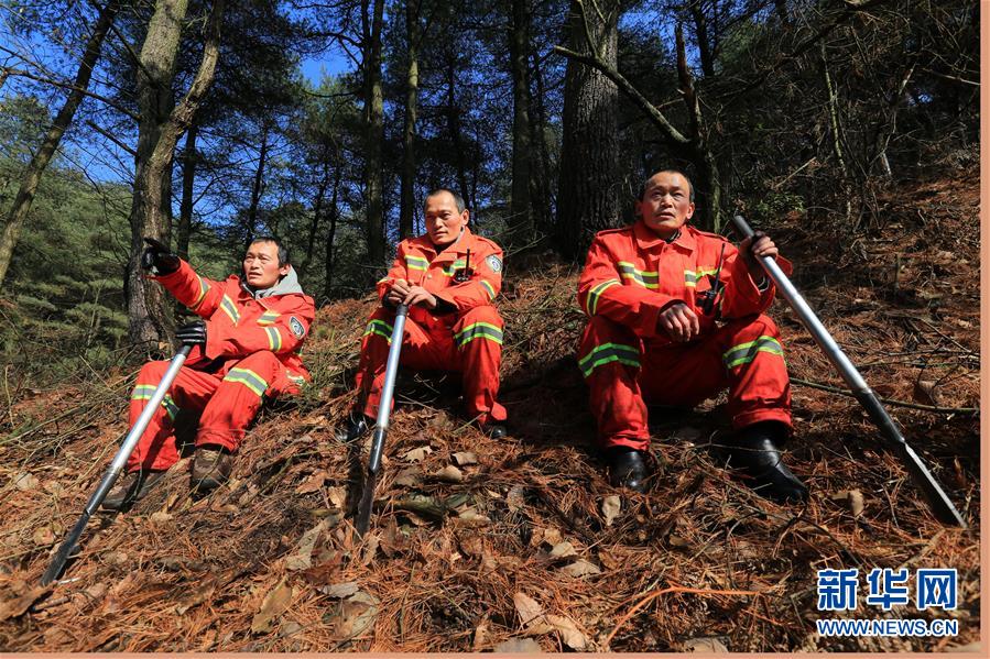 1月3日,张建(右)、张忠(中)、张华在拱拢坪林场护林巡山时在林间休息。新华社发(王纯亮 摄)