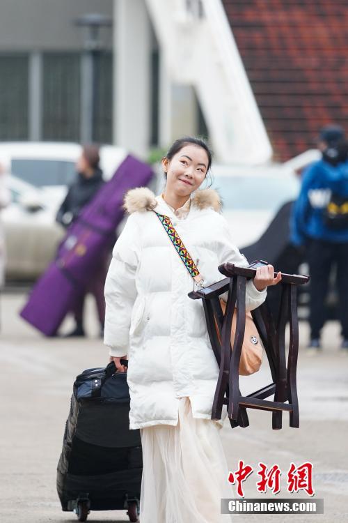 1月4日,贵州大学考点,一名考生拖着乐器表情轻松走进考场。当日,贵阳市温度2℃-6℃,贵州省2019年普通高等学校招生艺术类专业考试在贵州大学举行。中新社记者 贺俊怡 摄