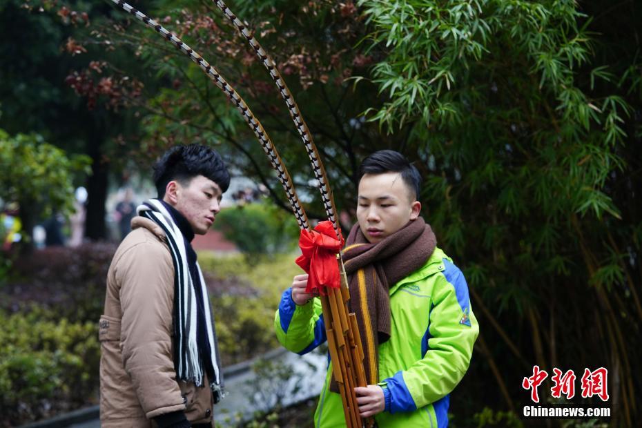 1月4日,在贵州大学考点,考生在考场外准备乐器。当日,贵阳市温度2℃-6℃,贵州省2019年普通高等学校招生艺术类专业考试在贵州大学举行。中新社记者 贺俊怡 摄