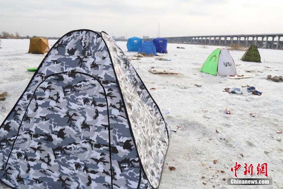 1月4日,钓友们在哈尔滨的江面上搭起一个个帐篷,加入冬钓队伍。图为江面上搭的帐篷。中新社记者 吕品 摄