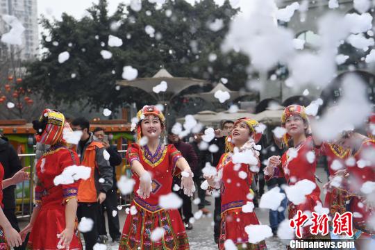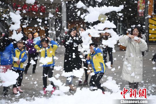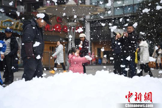 1月4日,重庆市渝中区“雪花”漫天飘起,吸引了不少民众前来玩耍。当日,重庆石柱首届冬季旅游推介活动在日月光广场举行。活动现场,工作人员利用人工造雪的方式向民众展现了石柱旅游的独特魅力。