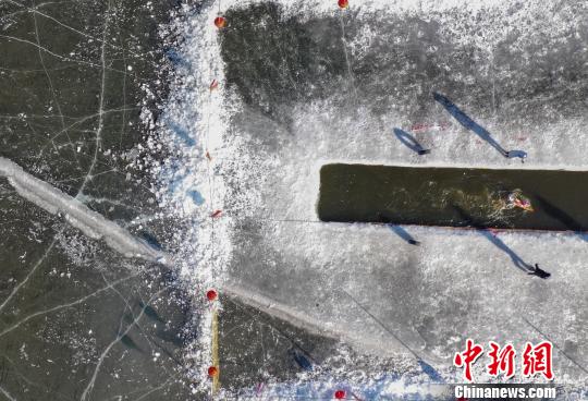 1月4日,航拍正在沈阳浑河里游泳的冬泳爱好者。冬泳爱好者在冰天雪地中挑战寒冷,磨练意志,通过冬泳运动,强身健体。当日,沈阳最高气温为-4℃,最低气温为-16℃。