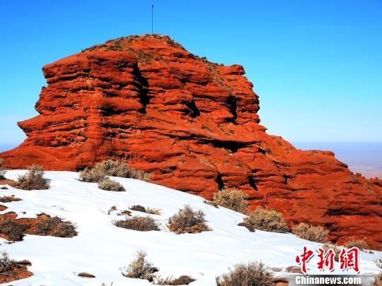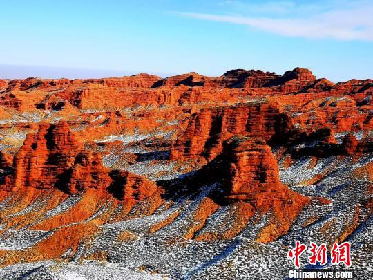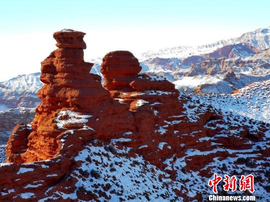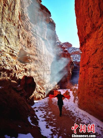 深冬时节,地处甘肃河西走廊中段,祁连山下的甘肃张掖市平山湖大峡谷景区,积雪仍未消融,晴朗的天气里,太阳照耀下的峡谷,红色砂砾岩在白雪映衬下,颜色鲜艳,景色别有一番风味。