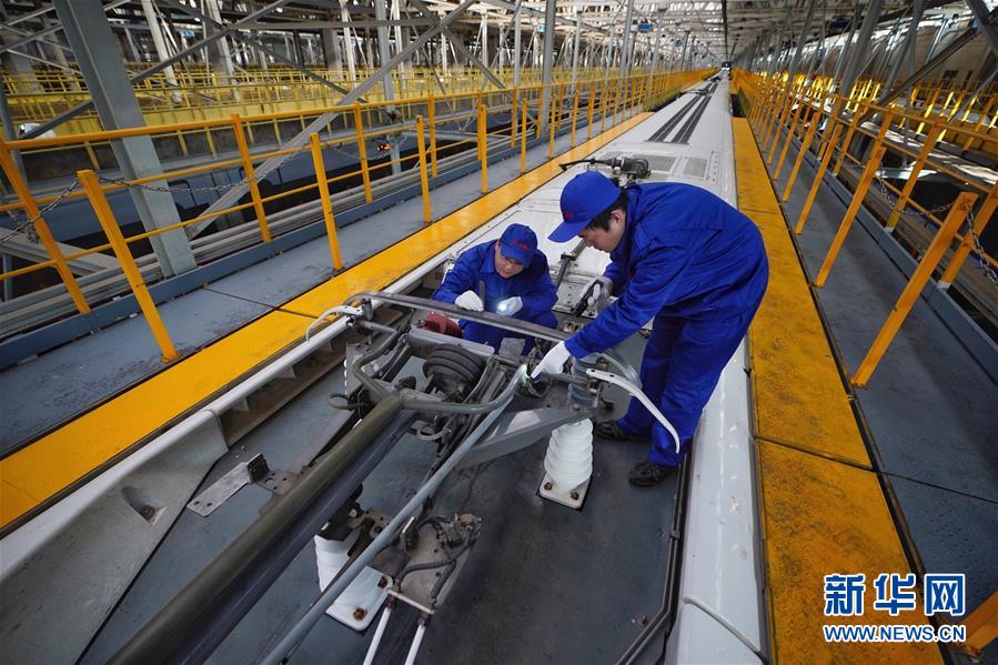 1月4日,工作人员在中国铁路北京局集团公司北京动车段检测即将上线的动车组。 1月5日零时起,全国铁路将实行新的列车运行图,17辆超长版时速350公里复兴号将首次亮相京沪高铁。据介绍,此次首次投入运营的17辆超长版复兴号动车组全长439.9米,载客定员1283人,载客能力较16辆编组提升了7.5%。 新华社记者邢广利摄