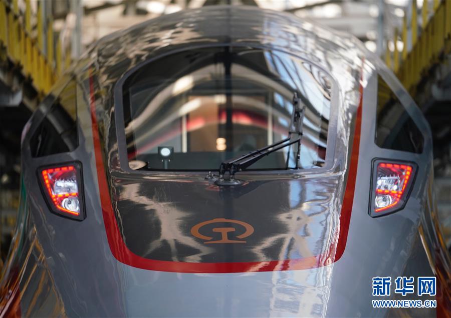 1月4日拍摄的停放在中国铁路北京局集团公司北京动车段即将上线的动车组。 1月5日零时起,全国铁路将实行新的列车运行图,17辆超长版时速350公里复兴号将首次亮相京沪高铁。据介绍,此次首次投入运营的17辆超长版复兴号动车组全长439.9米,载客定员1283人,载客能力较16辆编组提升了7.5%。 新华社记者邢广利摄