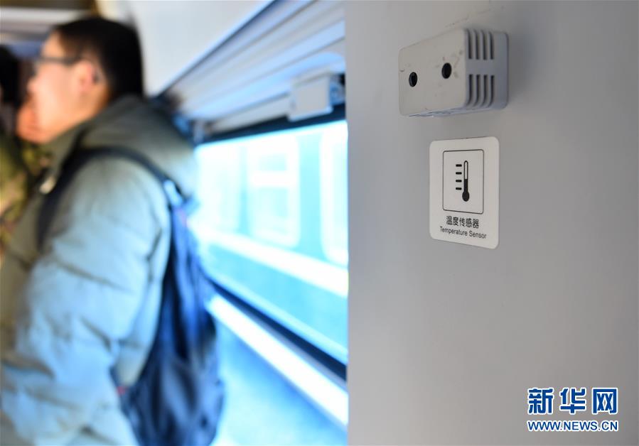 “绿巨人”列车车厢内设有温度传感器(1月4日摄)。 随着2019年全国铁路新列车运行图的实施,被昵称为“绿巨人”的新型时速160公里动力集中动车组——CR200J型复兴号列车即将亮相京沪普速线。这批“绿巨人”列车上线运营后,将主要替换京沪普速线去往杭州、上海、上海虹桥、南京的列车。 新华社记者 张晨霖 摄